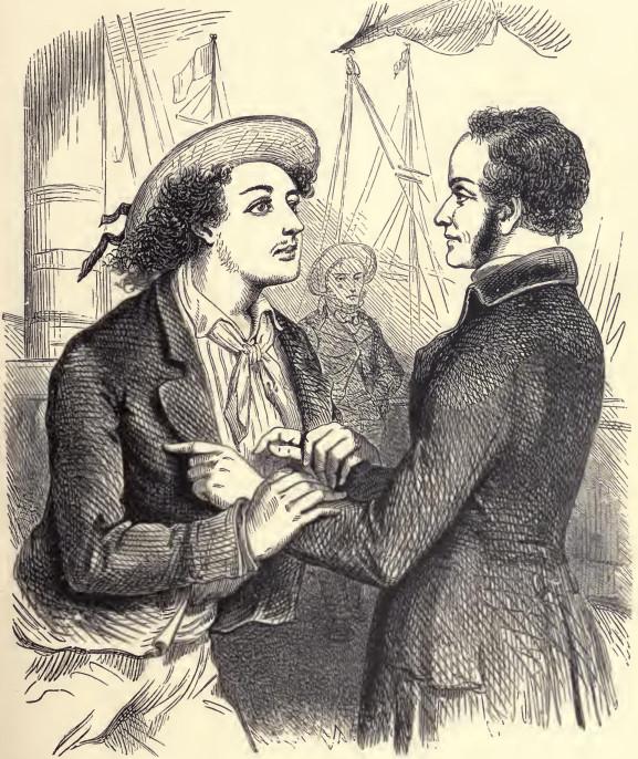 En voyant venir cet homme, le jeune marin quitta son poste à côté du pilote, et vint, le chapeau à la main, s’appuyer à la muraille du bâtiment.